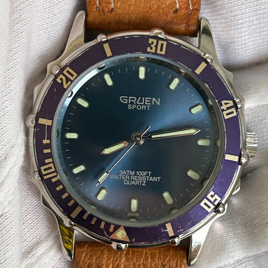 Reloj Gruen Sport Hombre 1999 Cara Azul Rayos Sol Pulsera Original Único