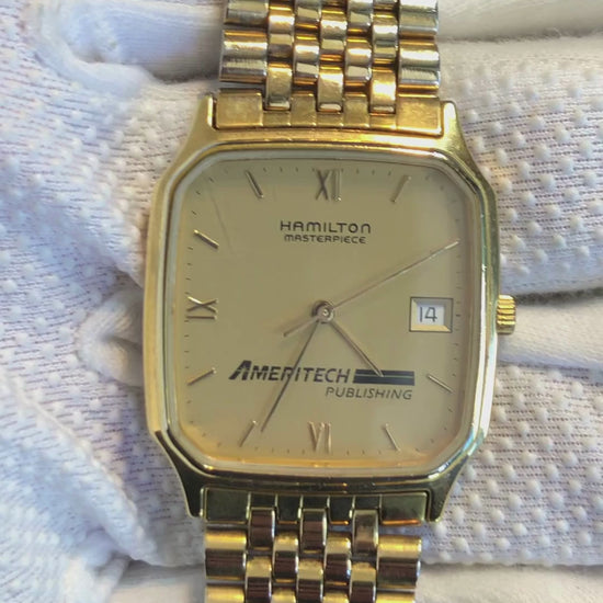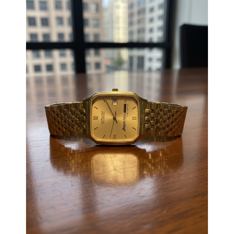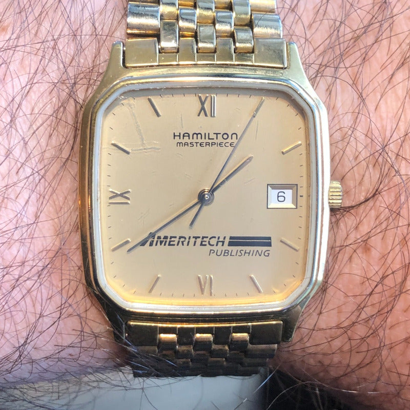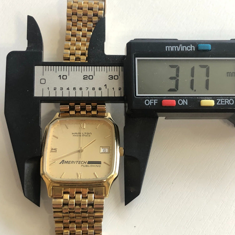Con pulsera original y con marcas en el cristal en la parte superior izquierda. El Hamilton Masterpiece Ameritech Publishing (ref. 9742) pertenece al período 1994–1996, cuando Hamilton —ya bajo el paraguas del Swatch Group— producía ediciones corporativas de regalo para ejecutivos y empleados. La numeración “9742” identifica la serie de relojes de cuarzo con caja cuadrada y bisel dorado de metal base, fondo de acero y movimiento suizo ETA, usados en campañas institucionales de mediados de los noventa. El logotipo de Ameritech Publishing, nombre que la empresa usó solo entre 1993 y 1999, confirma esa ventana temporal. Su diseño sobrio con índices romanos parciales y ventana de fecha refleja el estilo “executive dress” propio de esa década, una etapa en que Hamilton consolidaba su identidad suiza sin abandonar la estética clásica estadounidense. Ameritech Publishing fue una subsidiaria de Ameritech Corporation, uno de los siete gigantes de telecomunicaciones surgidos tras la fragmentación de AT&T en 1984. La división Publishing se dedicaba a la edición y distribución de guías telefónicas impresas —las tradicionales “Yellow Pages”— y material corporativo de comunicación en el Medio Oeste de Estados Unidos (Illinois, Indiana, Ohio y Michigan). Durante los años noventa, Ameritech experimentó un fuerte auge gracias a la expansión de la telefonía local y al patrocinio de programas tecnológicos, lo que llevó a la compañía a encargar relojes conmemorativos Hamilton como obsequios a empleados con años de servicio. En 1999, Ameritech fue adquirida por SBC Communications, que más tarde se fusionaría con AT&T, marcando el fin de la marca Ameritech como entidad independiente. Pieza única.