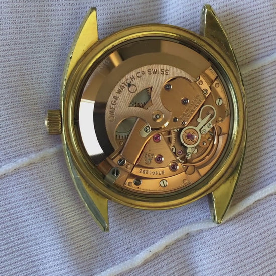 La caja está construida en plaqué or G de 20 micras, con fondo de acero inoxidable, tal como indica el grabado original. Este sistema de chapado era el estándar de Omega en relojes de gama alta de los años 60 y se realizaba por laminación industrial. El fondo de acero aporta estabilidad estructural y durabilidad frente al uso prolongado.