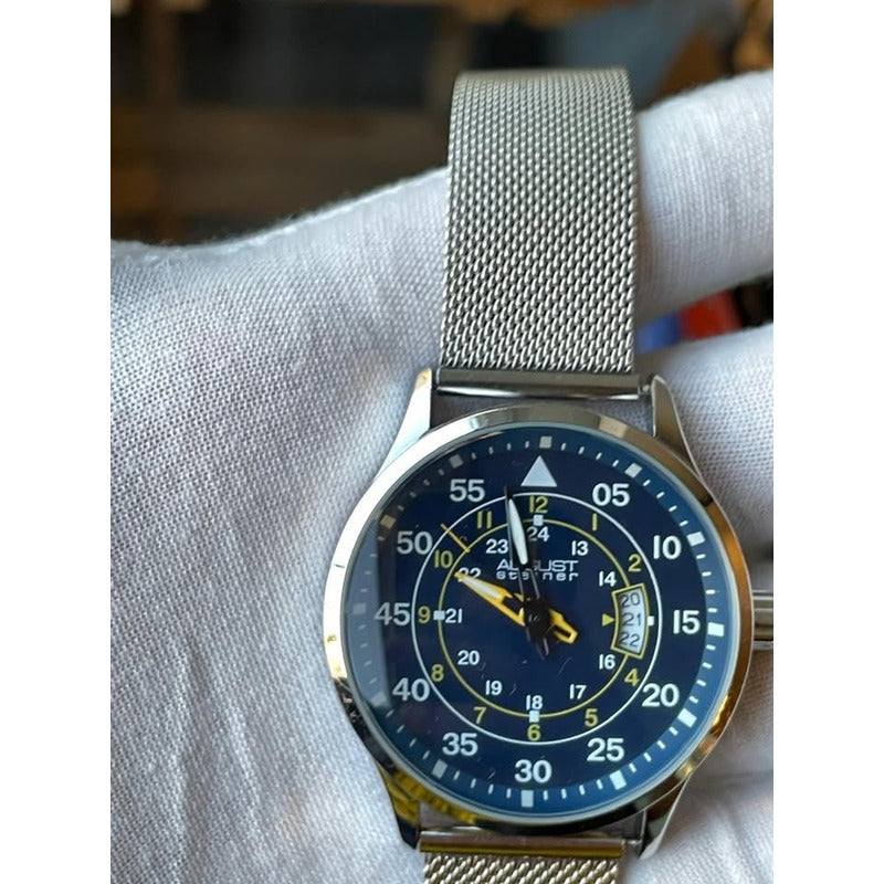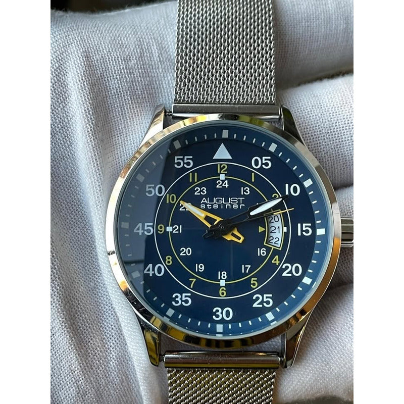 August Steiner, marca estadounidense reconocida por ofrecer relojes con estética de lujo a precios competitivos. Su movimiento de cuarzo garantiza precisión en el tiempo, mientras que su resistencia al agua de hasta 30 metros lo hace adecuado para el uso diario y salpicaduras ocasionales. La caja de 43mm de aleación plateada y la correa de 22mm de acero inoxidable tipo malla no solo aportan durabilidad, sino que también ofrecen un acabado pulido. Impulsado por un movimiento de cuarzo japonés, ofrece funciones de hora, minuto, segundo y doble huso horario (GMT). #bit#