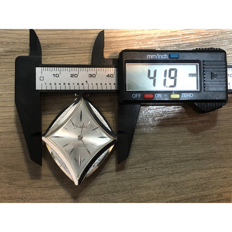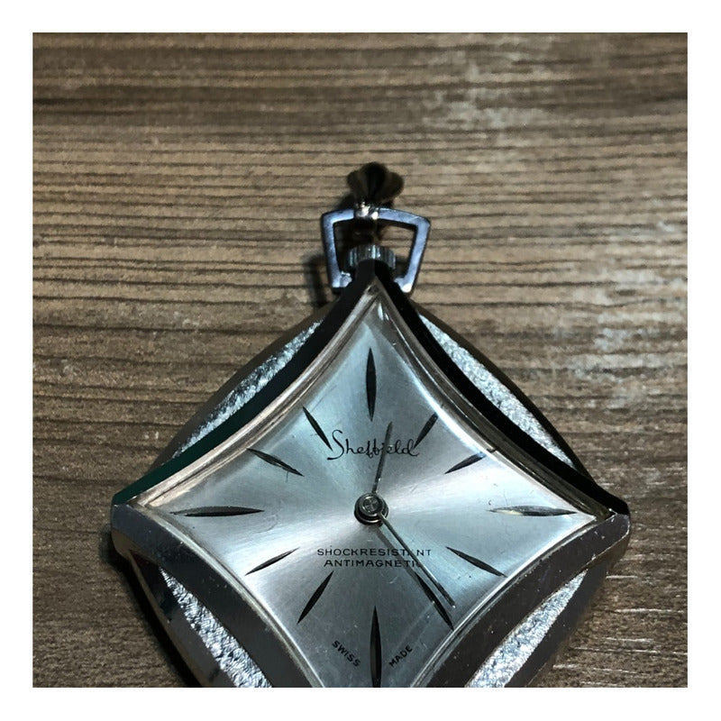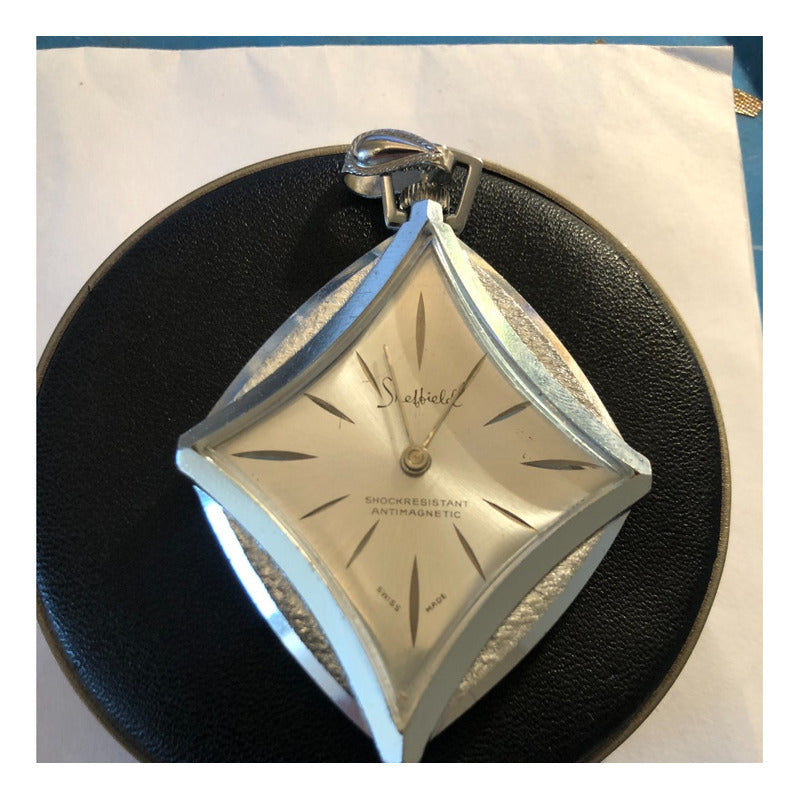 La marca Sheffield tuvo su auge principalmente entre los años 1950 y 1970. Este reloj colgante mecánico con movimiento suizo y caja de aluminio fue fabricado entre finales de los años 60 y mediados de los 70, ya que ese tipo de diseños (colgante/perlado para mujer, caja grande de aluminio y movimiento de cuerda suizo) eran populares en esa época.