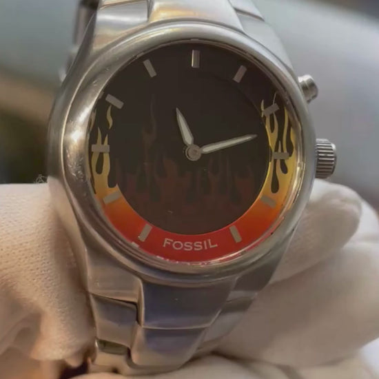 Reloj unisex de la mítica línea de FOSSIL: Big Tic. Muy escaso. Pilas nuevas (RENATA). Esta pieza tiene el dial con llamas que se prende y apaga como se ve en las fotos, funciona perfecto. ¿Qué lo hace raro? Tecnología Big Tic: Combinación de visualización analógica + animación digital de segundos. Este sistema es visualmente llamativo y ya no se fabrica. Difícil de encontrar: No es común verlo en tiendas ni en subastas. Estética retro-futurista.